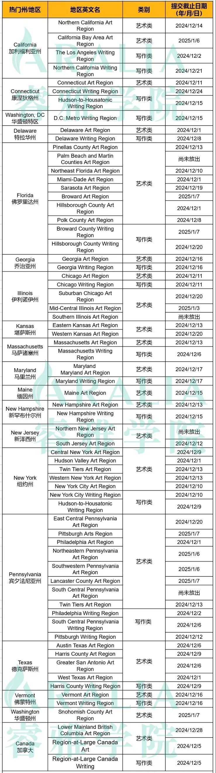 为了方便同学们进行截止时间查询,机构对美国热门州/地区,以及加拿大地区的不同类别(艺术类与写作类)参赛截止时间进行了汇总。
