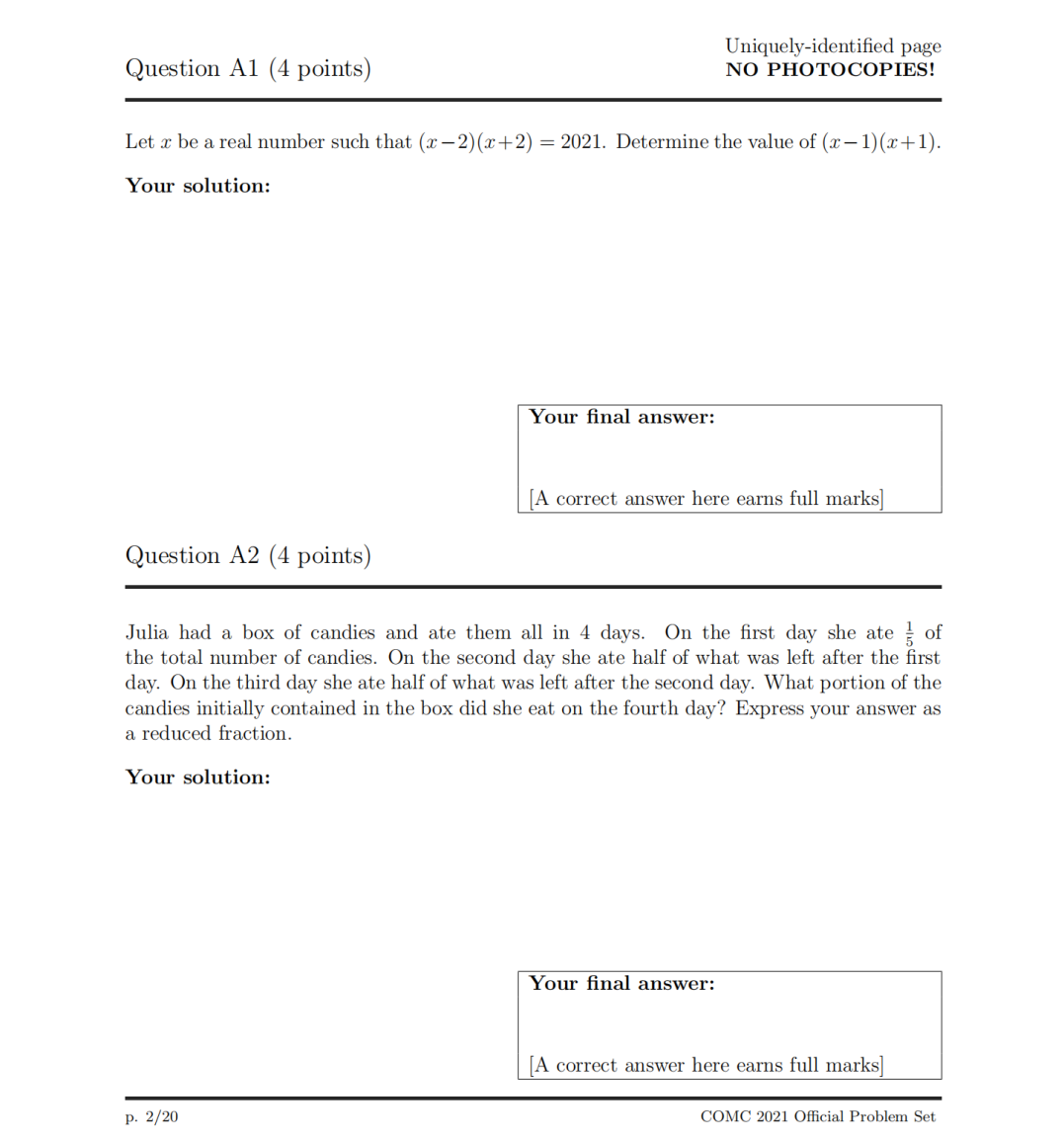 COMC(Canadian Open Mathematics Challenge)加拿大数学奥赛,又称加拿大数学公开赛,是由国际权威学术机构加拿大数学学会 (CMS) 举办。作为加拿大最具影响力的数学竞赛,每年参加人数高达上万。
