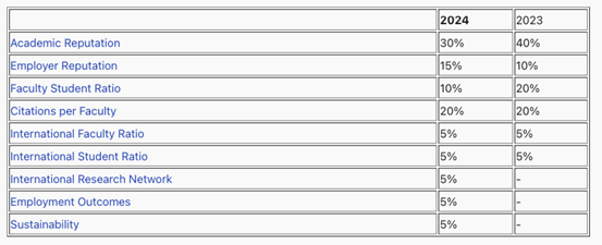 QS排名自2003年首次发布以来,排名算法基本保持不变,按照QS官方的说法为了应对高等教育界的最新变化,2024版排名新增了三项指标:国际研究网络,就业表现和可持续性,分别占比5%。原来的六项指标中,雇主声誉,学术声誉的比重分别下降了10%和10%。最新的排名指标及比重如下: