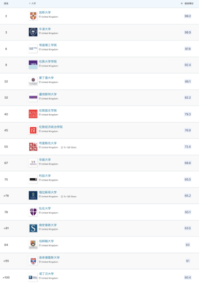 在世界排名前100当中,排名上升的英国大学包括格拉斯哥大学(+5)、利兹大学(+11)、杜伦大学(+14)、伯明翰大学(+7)、圣安德鲁斯大学(+1)。