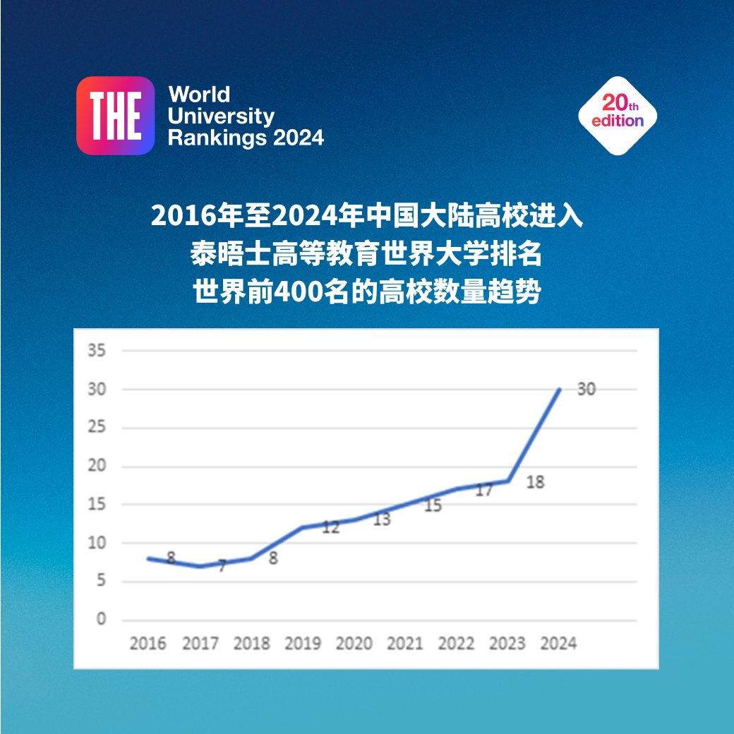 进入世界排名前 400名的中国大陆高校数量从去年的 18 所大幅增加至今年的 30 所。中国大陆共有 86 所大学上榜,是入榜高校数量排名第五的国家/地区。