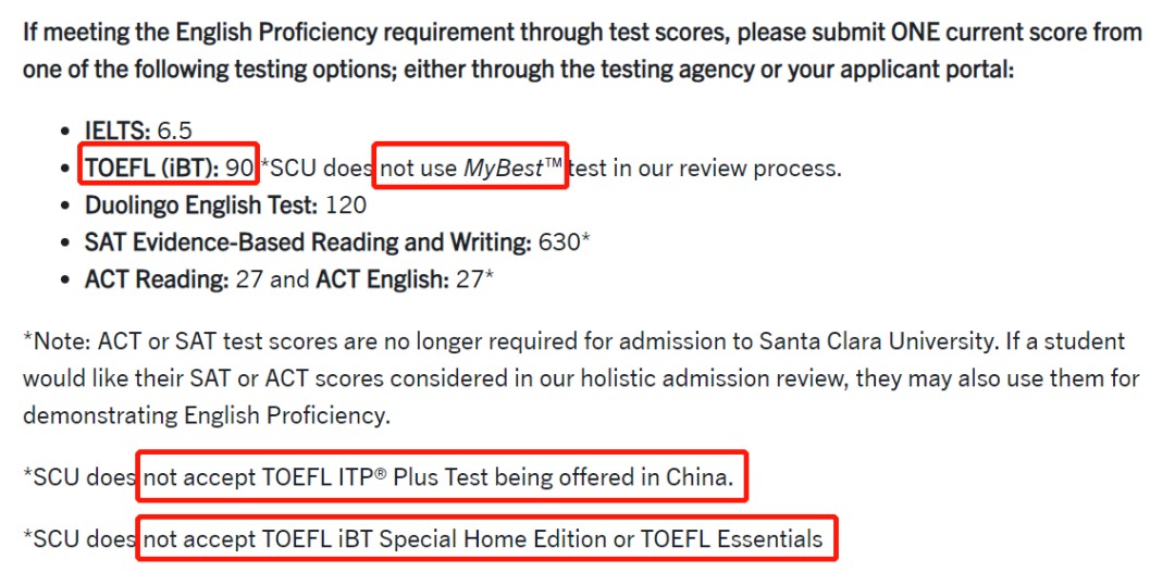 作为一所排名50左右的美国大学,该校的成绩要求比较常规,托福90分且无小分要求即可符合最低申请要求。但要注意申请SCU不要使用家考托福成绩以及托福拼分。