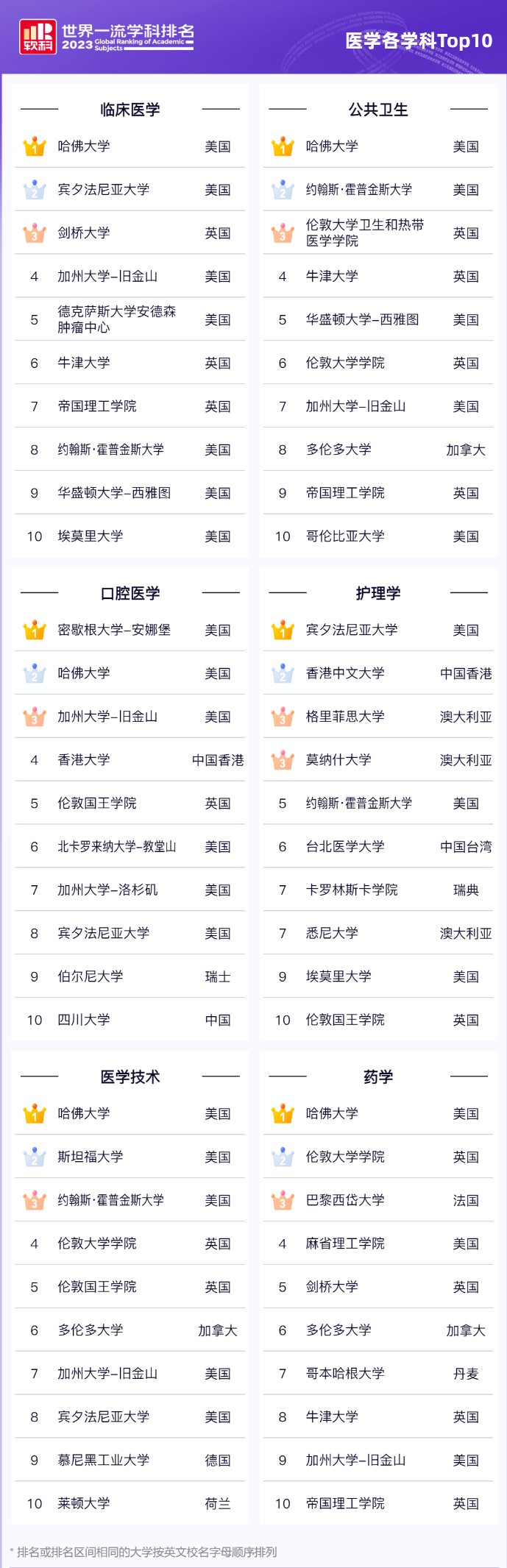 美国包揽了医学专业前列,6项专业排名中,哈佛大学占据了4门学科的全球第一。