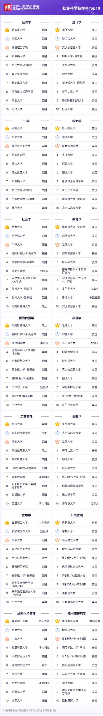 其他拥有超过10个世界十强学科的高校有清华大学(16个)、牛津大学(11个)、哥伦比亚大学(11个)、上海交通大学(11个)、宾夕法尼亚大学(11个)。