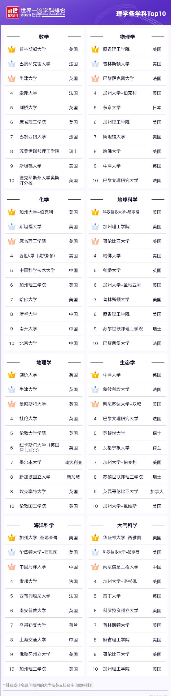 理学排名与2022年相比略有变动,在数学学科排名中,普林斯顿大学超过巴黎萨克雷大学,位居Top1;化学学科排名中,清华大学、南开大学和北京大学取代芝加哥大学、剑桥大学和苏黎世联邦理工大学,跻身Top10榜单;