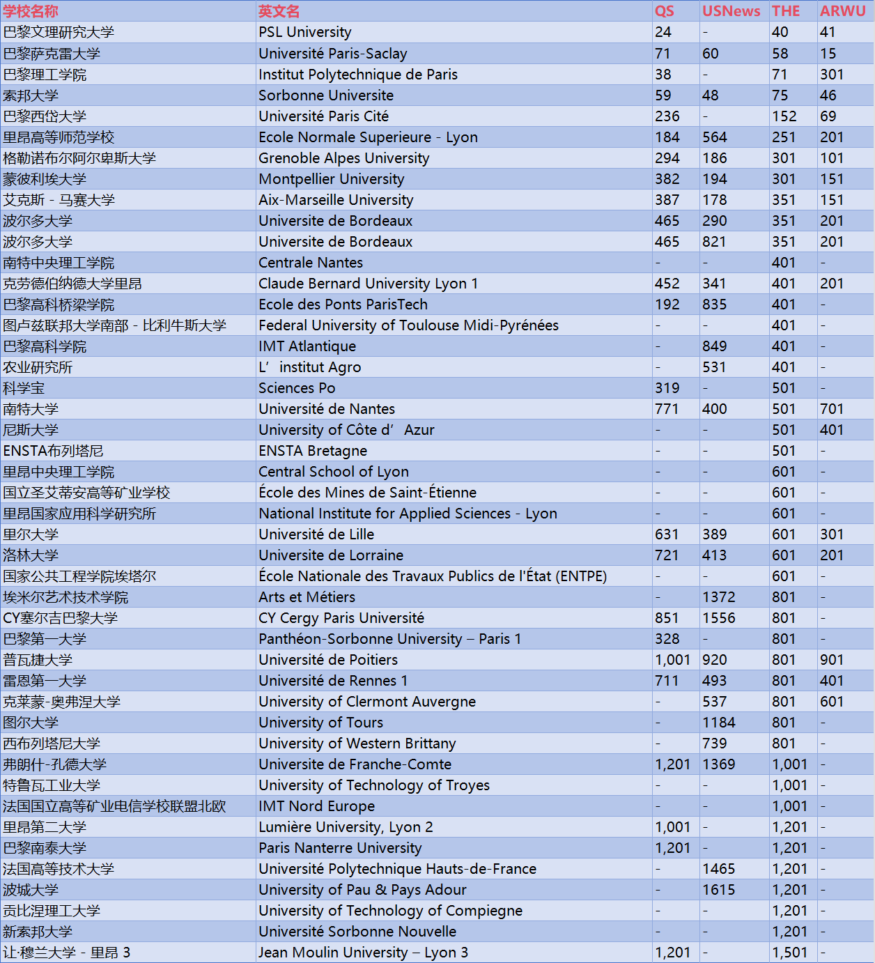 留求艺还整理了泰晤士世界大学排名、usnews世界大学排名中法国大学的排名情况,供大家对比和参考!