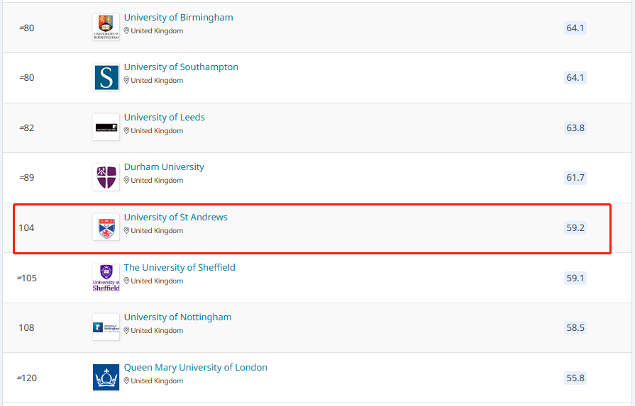 2025圣安德鲁斯大学QS世界大学排名#104