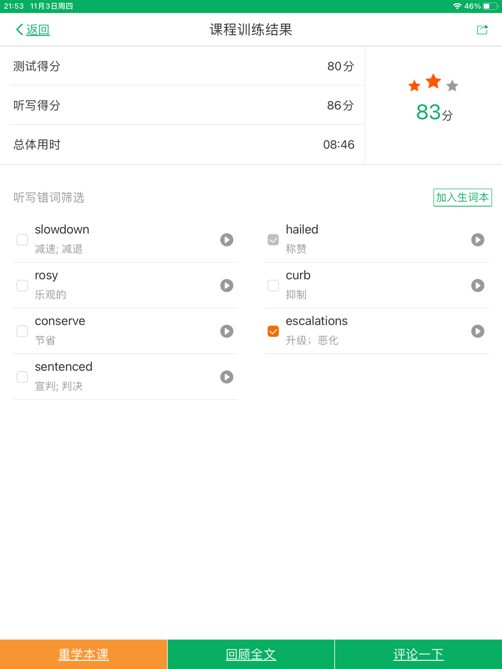 当然“少则得,多则惑”。在可可英语这款软件上,我初步深耕使用最多的就是它的“训练”板块, 里边的听写训练素材有影视剧也有新闻,我每天一般选择的是新闻来听,听完就可以做题,有选择理解还有句子听写,软件还会依据你的答案给你打分,可以很好地校对自己的听力理解和单词掌握情况。而且,对于材料中我们可能不熟悉的一些词汇,它也会给你细心地标注出来,这点必须点赞。