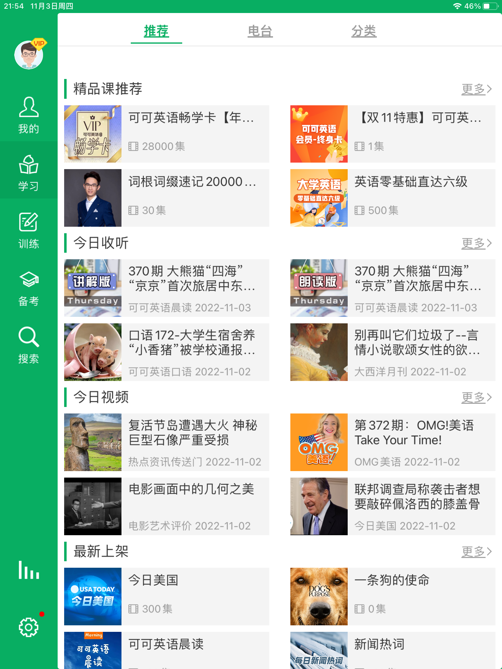 可可英语太强大了,有课程、播客、视频、还有原声的一些国外新闻网站、记录片、美剧、备考雅思、托福等各类考试的,它的“学习”栏强大到,一旦走进去就别想出来了,免费资料多到学不完,英语学习真的会上瘾。