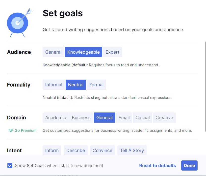 这个我是下载的pc端,它也有在线版。这个软件亲身体验一直非常非常非常不错。我一般给别人写完邮件或者写论文,在发出去之前,都会放到Grammarly进行检查,在这个软件里你可以设置想要达成的目标,比如,我们发邮件和写论文这两个场景,所设置的目标肯定是不一样的。