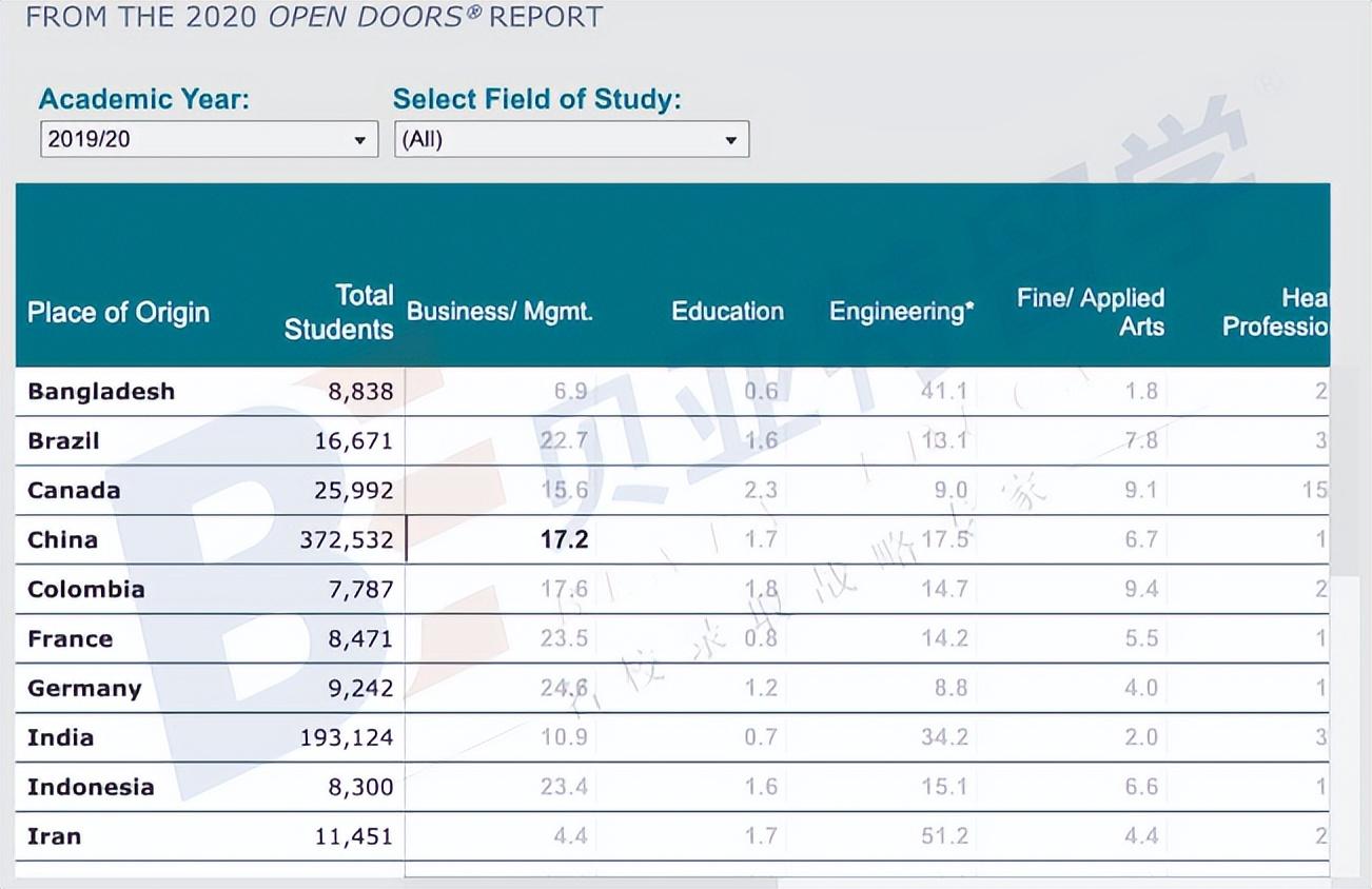 2020年中国赴美留学生里,商科专业占比为17.2%,仅次于CS和工程类专业。