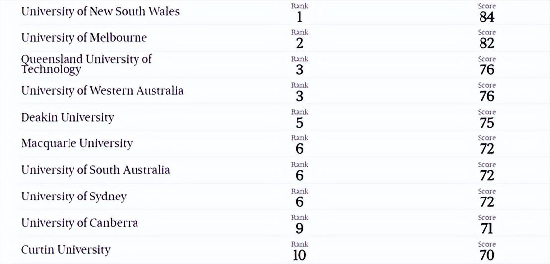 该排名根据学校的质量、商学院的声誉以及毕业生就业和薪资前景(“职业影响力”)三个类别的得分,对澳洲学校的商学院进行了排名。该数据仅涵盖研究生层次的课程,总体排名对三个指标给予同等权重。