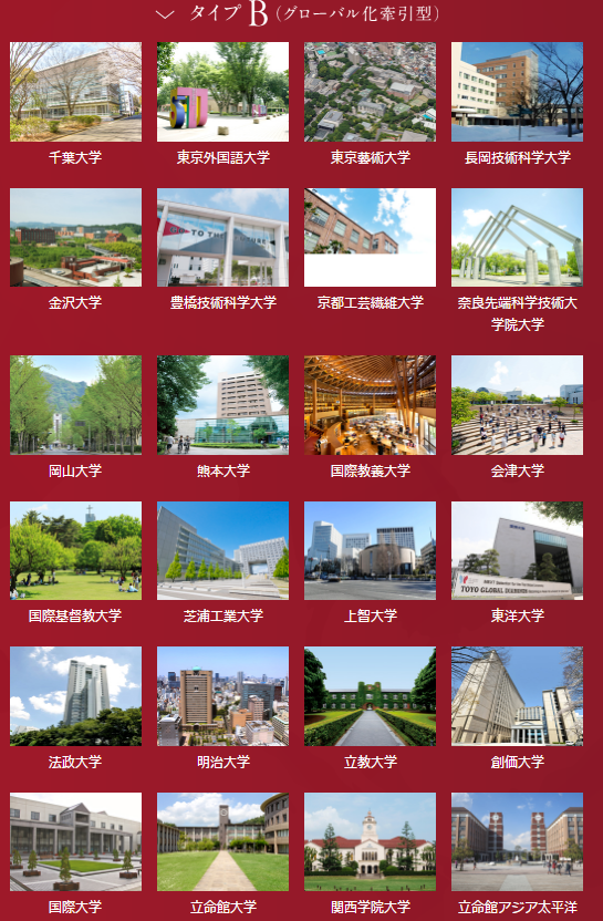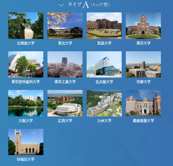 其中A类院校13所,又被称之为顶尖型院校,都是实力相当,很有可能排进世界前100名的大学,因此也叫做TGU(Top Global University)。他们分别是: