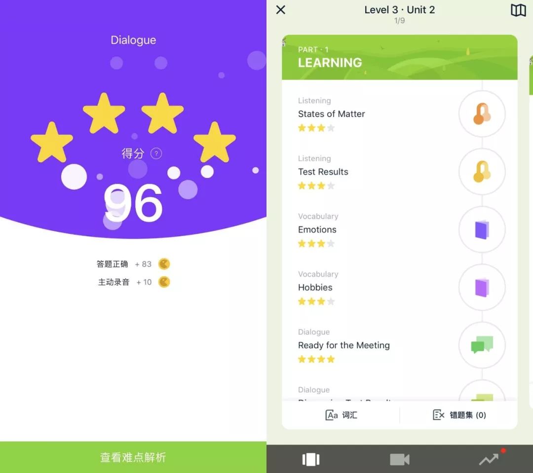 主动跟读的频率和正确率越高,课时的分数也会越高。所以有的学生从第一天到死都不开口,到现在看到录音键就兴奋,钟爱赚钱的人,看到金币心里就会很高兴。