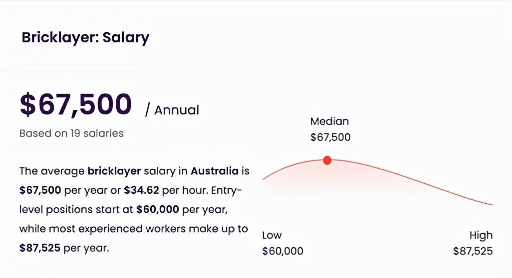 目前,砌砖工的时薪中位数在34.62澳币左右。入门级职位的年薪大约为每年 60,000澳元,而大多数有经验的工人每年可以赚到高达 87,525澳元的薪水。