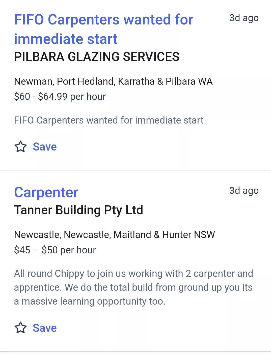由于技工短缺的原因,正在招聘的木工时薪要比统计数据要高,下面是澳洲最大招聘网站的木工招聘广告: