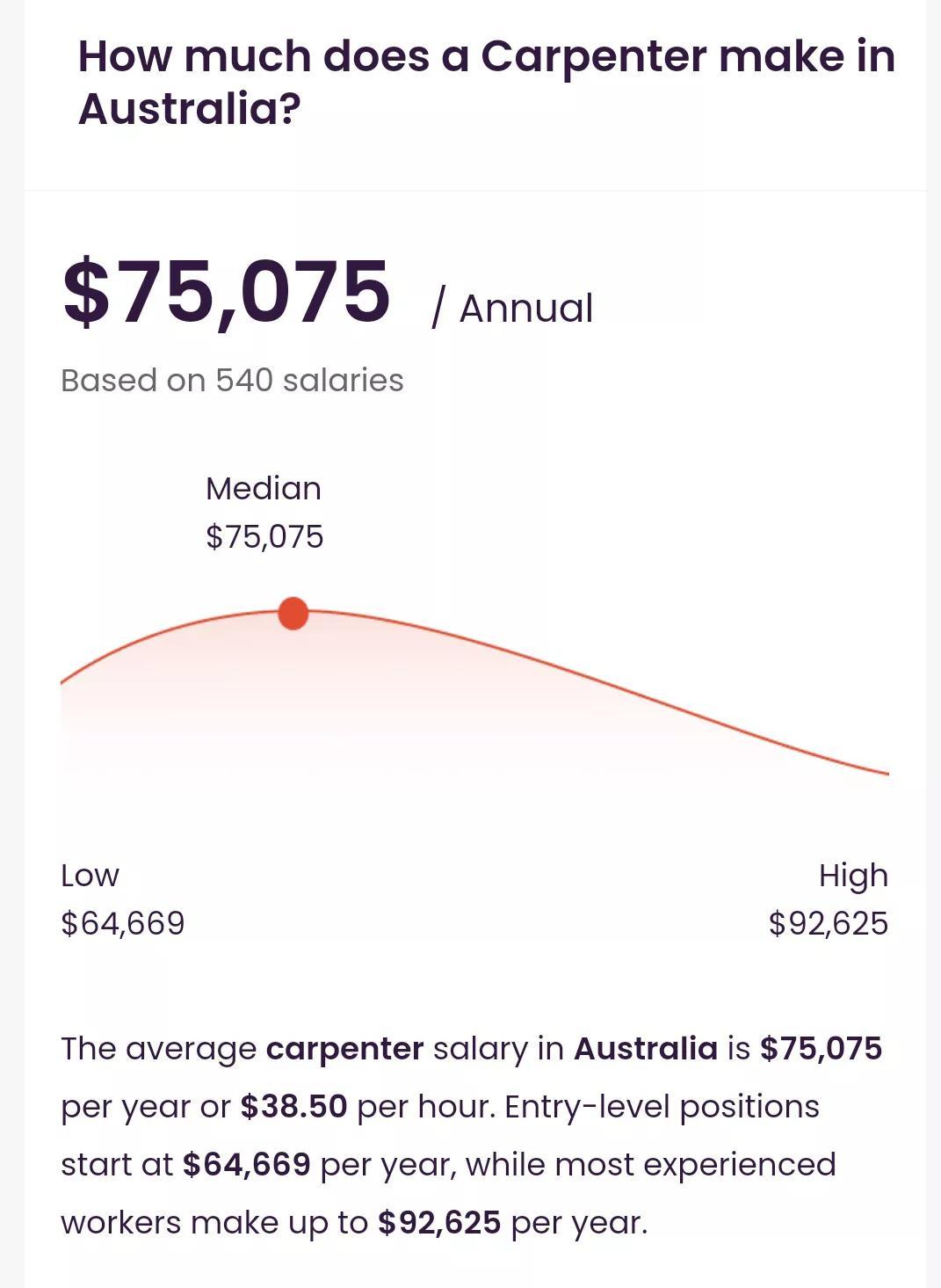 回到大家关心的问题,在做澳洲木工一年收入会有多少呢?根据澳洲招聘网站给出的数据是平均年薪是7.5万澳币左右。