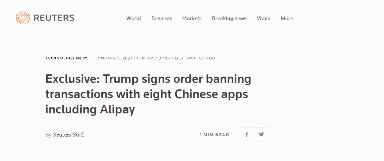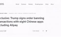 据路透社最新独家消息,包括支付宝在内的8款中国应用软件成为了美国最新的制裁目标,被禁止的8款应用将不能与美国企业或个人进行交易。这8款应用分别是支付宝、QQ、QQ钱包、微信支付、全能扫描王、WPS办公软件、茄子快传以及VMate。