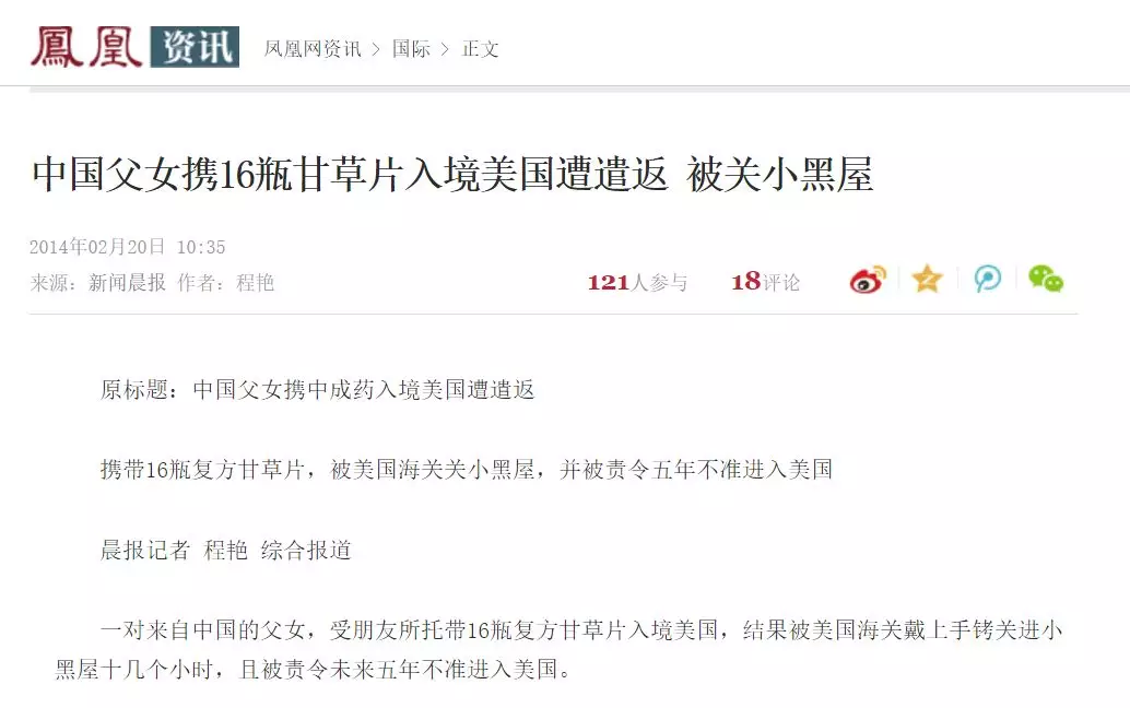 比如,中国一对父女携带16瓶甘草片入境美国,结果不仅被遣返,还被责令5年不准进入美国。