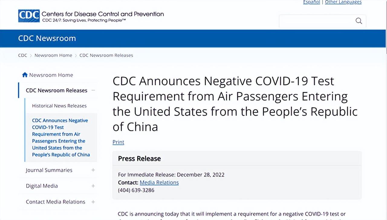美国疾控与预防中心网站(CDC)当地时间28日发表最新声明,从中国大陆、香港或澳门飞往美国的两岁及以上乘客需要在飞行前不超过两天时接受新冠病毒检测,并在登机前向航空公司出示“阴性检测证明”。新冠测试的手段可以是PCR测试,即所谓的“核酸检测”;也可以是通过远程医疗服务进行的抗原自我测试。同时,CDC网站信息显示,在航班起飞前10天以上检测呈阳性的乘客,可以提供康复文件以代替阴性检测结果。上述新规则将于美国东部时间1月5日凌晨12点零1分生效。