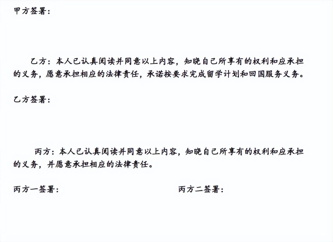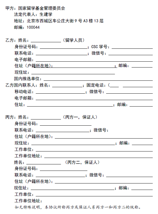 “国家公派出国留学协议书”是由国家留学基金委(甲方),与留学人员(乙方)及保证人(丙方一、丙方二)共同签署的。其中需要填写乙方及丙方的相关信息,见下方截屏。