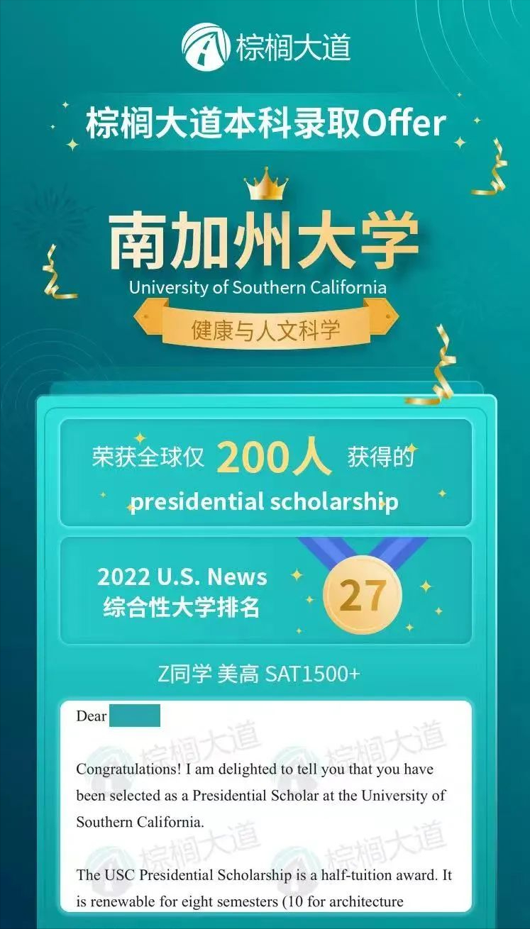 值得开心的是,2021-22申请季,棕榈学员Z同学顺利收获了USC总统奖学金录取,非常难得!