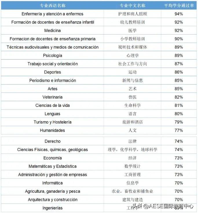 为了帮助各位同学更深刻了解西班牙的毕业难度,为大家找到了2021年西班牙教育部发布的“各本科专业平均学分通过率”统计表,计算方式是学生“通过的学分/注册的学分”也就相当于大家所说的毕业难易程度。我们一起来看下西班牙各个热门专业的毕业难易程度吧!