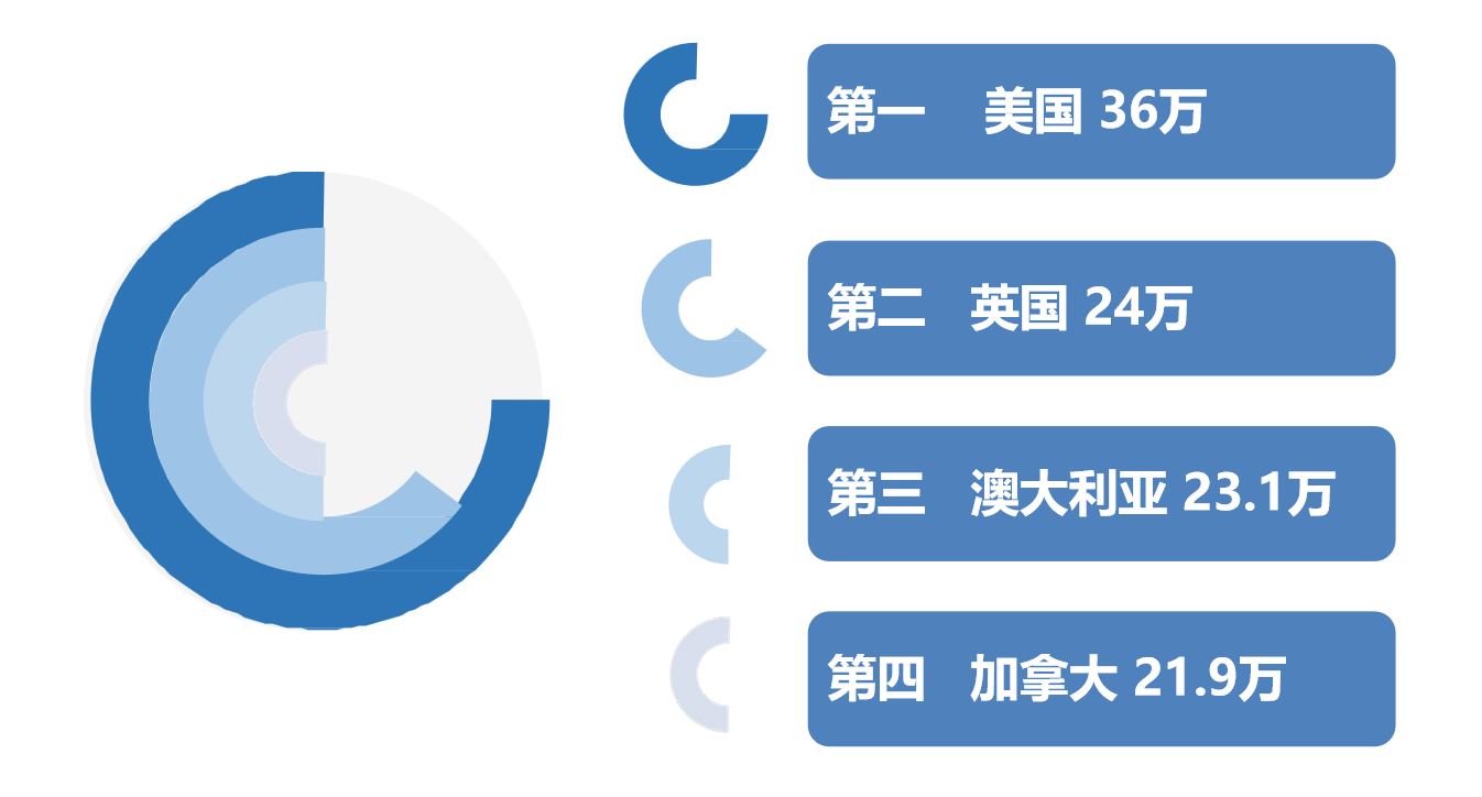 目前,中国已经成为了世界第一大留学生输出国。 1978年 至2019年,中国出国留学总人数达到了656.06万人, 423.17 万人在完成学业后选择回国发展,占已完成学业群体的 86.28%。