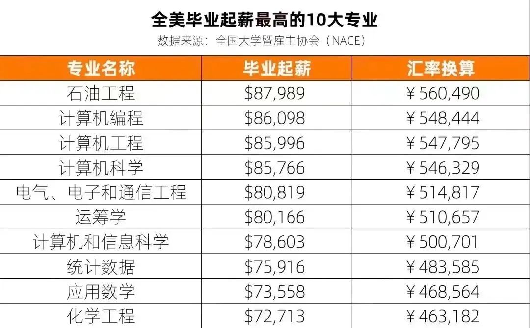 根据《中国留学发展报告》发布的近几年中国留学生赴美留学的热门专业与未来就业情况来看,全美起薪最高的top10专业仍然以STEM专业为主。