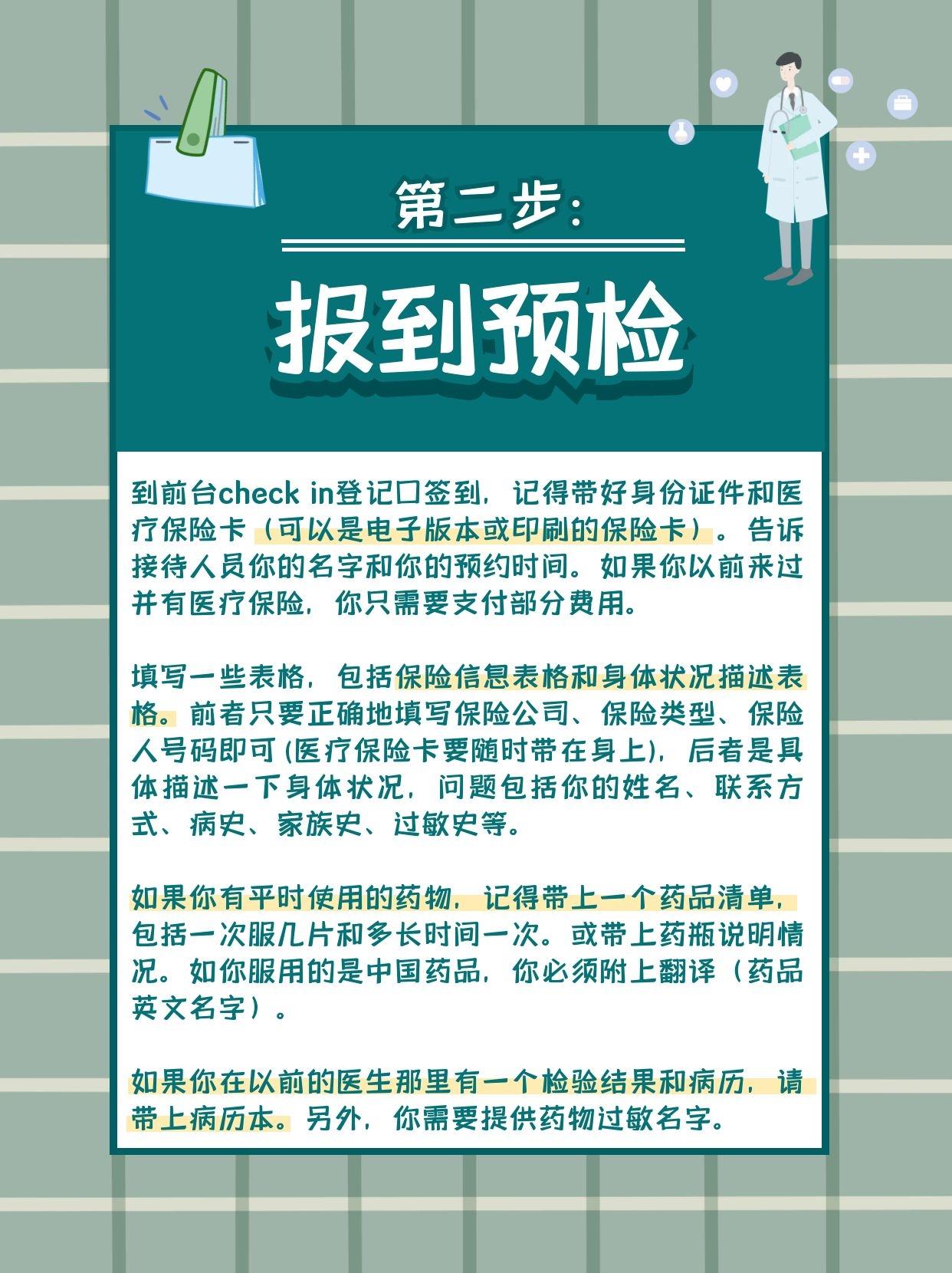 需要填写一些表格,包括保险信息表格和身体状况描述表格。前者只要正确地填写保险公司、保险类型、保险人号码即可(所以医疗保险卡要随时带在身上),后者是具体描述一下身体状况,问题包括你的姓名、联系方式、病史、家族史、过敏史等。