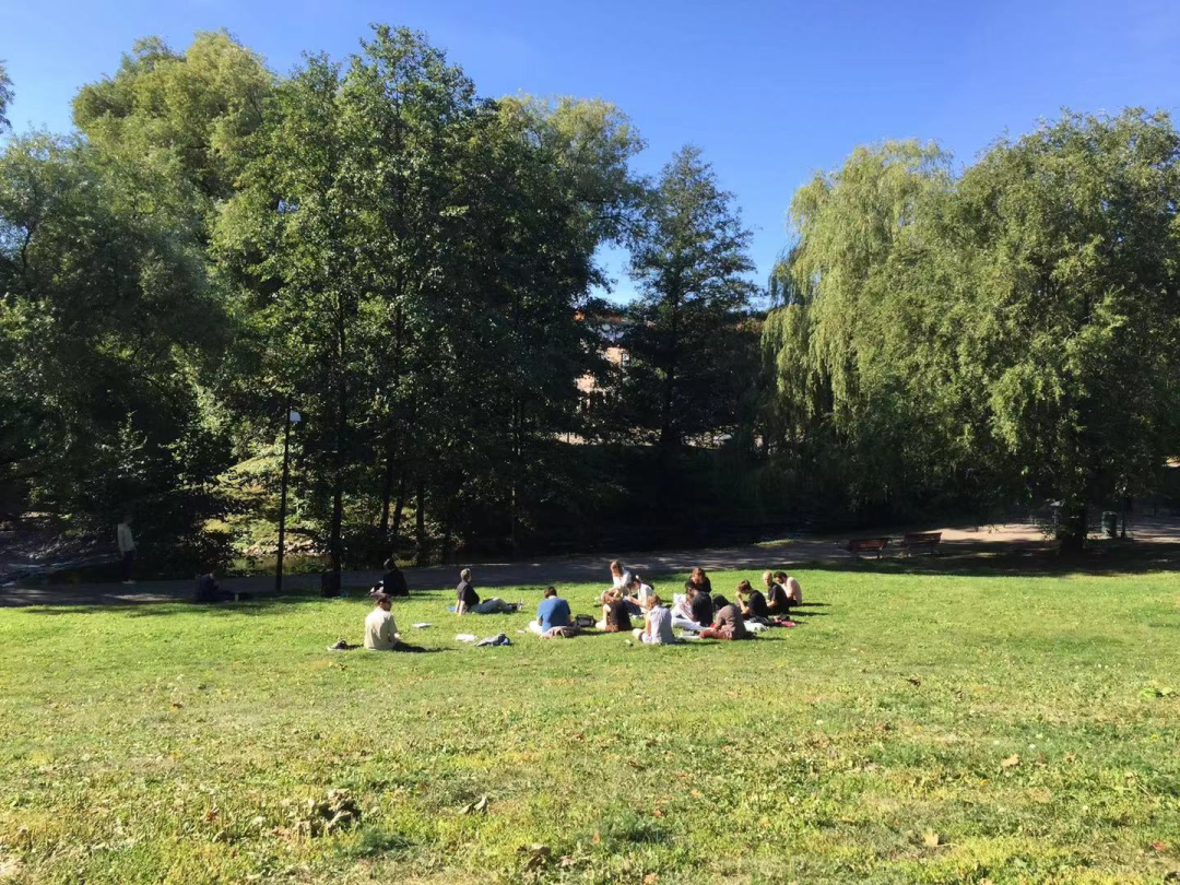 日常躺在小溪附近的草坪上,老师带着学生边晒太阳边讲课,讲完了之后小组讨论,小组讨论之后,同学带着同学互相玩。学scenarios就去奥斯陆博物馆,听工作人员讲奥斯陆的历史、讲糖果工厂和老房子。