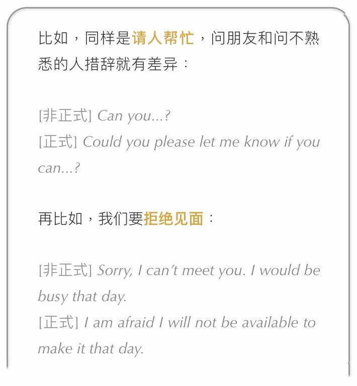 如果上面的例子还不够清晰,大家可以仔细研究一下下面这个例句表。左边一栏正式,右边一栏非正式