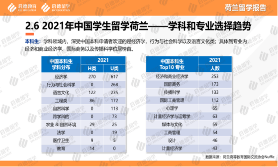中国留学生留学荷兰的学科分布主要集中在商科、工程类、传播媒体、医疗专业等。根据启德教育发布的《2022荷兰留学报告》显示,中国留学生本科阶段以商科留学为主,前十大专业为:经济和商业经济学、国际商务、传播科学、国际工商管理、心理学、计量经济学与运筹学、媒体与文化、工商管理、设计、计量经济学。