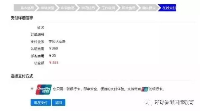 学历认证费用为350元,邮寄费用北京市内RMB15元/件,其余地方及香港是RMB25元/件,澳门台湾是RMB95/件。(认证最后都是从北京市的留服寄出来的。)线上支付仅支持银联卡支付,不支持支付宝微信支付,请大家准备好银联卡。