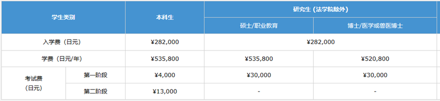 一桥大学的学费相对而言,标准比较统一,该校除经济管理研究科(学费为3.3万人民币)、法科大学院(学费为4.1万人民币)之外,其他研究科的学费均为2.75万元人民币。