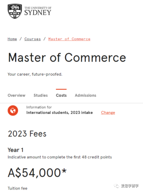 以最贵的悉尼大学以及中国留学生最多的商科硕士为例,Master of Commerce在2023年国际学生的学费为54,000澳元,2022年学费52,500澳元,2021年为50,000澳元,一直在上涨。