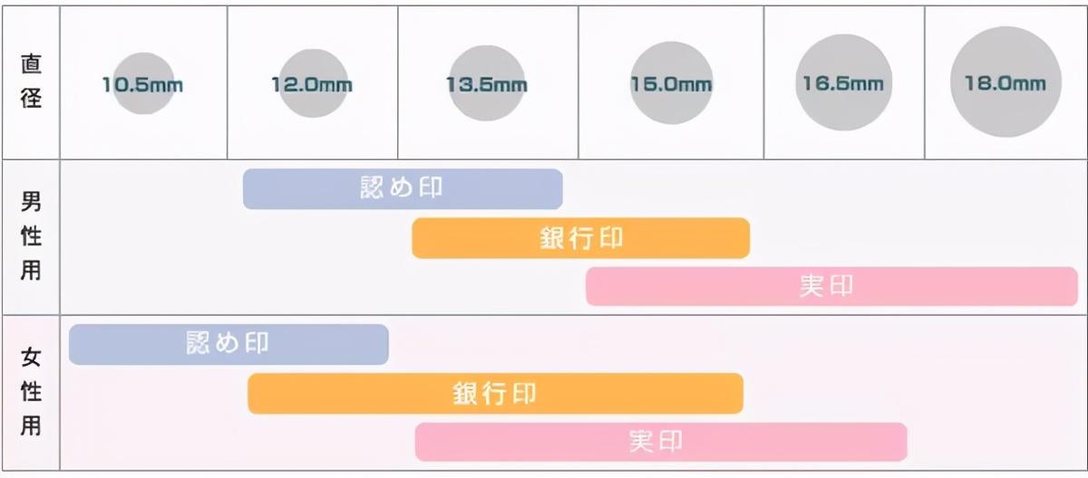 男士与女士所用的尺寸是不同的。一般来说男性用的认印直径一般在12.0-13.5mm之间,银行印则是13.5-15.0mm之间,实印则是15.0-18.0mm之间;而女性用的印章比男性用的要小巧一些,认印的直径一般为10.5-12.0mm之间,银行印为12.0-15.0mm之间,实印则为13.5-16.5mm之间。
