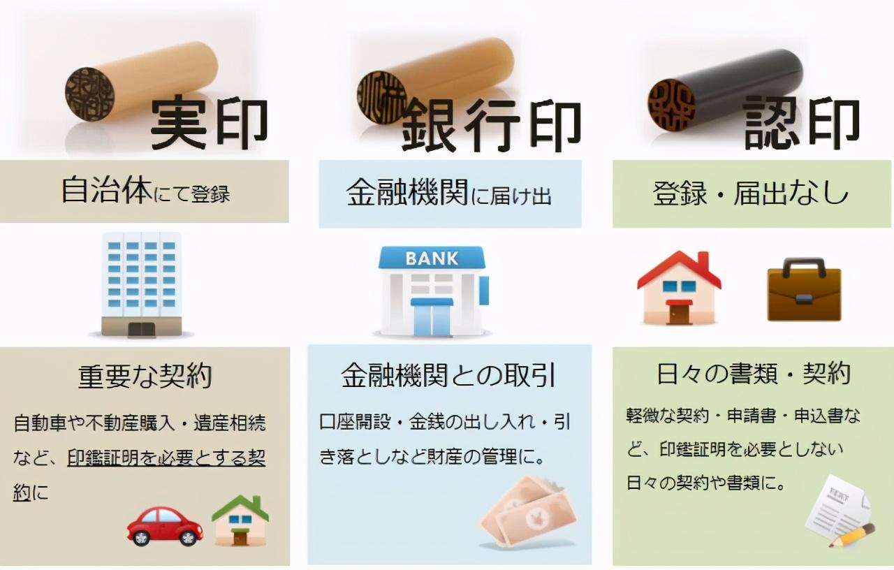 首先我们先说一下印章的种类,在日本印章大致分为三类:认印、实印和银行印。下面我们简单给大家介绍一下。