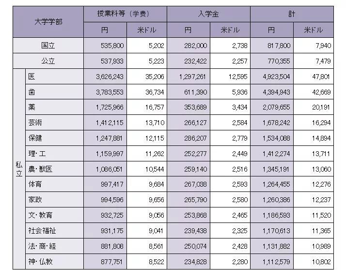 日本的大学分为国公立大学和私立大学。由于文部科学省规定了国立大学入学金和学费的标准金额,所以大部分国立大学都是按照标准来的,私立大学的话根据专业的不同,学费也会有很大差异。