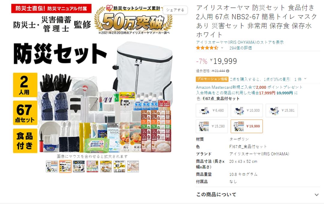 其次就是一些防灾物资的囤积,可以准备一个应急包(如果非常担心地震等自然灾害的话)我是没有准备的,但是还是给想要准备的同学说一下,亚马逊上也都有卖,大概的内容就是应急手电,一些医药品,两瓶矿泉水和一些压缩饼干,当然也有更高级的,里面的物资功能更多更全面,同学们可以根据自己的需要进行准备,不过以我来到日本之后的经验来看,除非是八九级的大地震,一般的情况是用不到的,地震来了就摇几下,大家的生活基本不受影响。