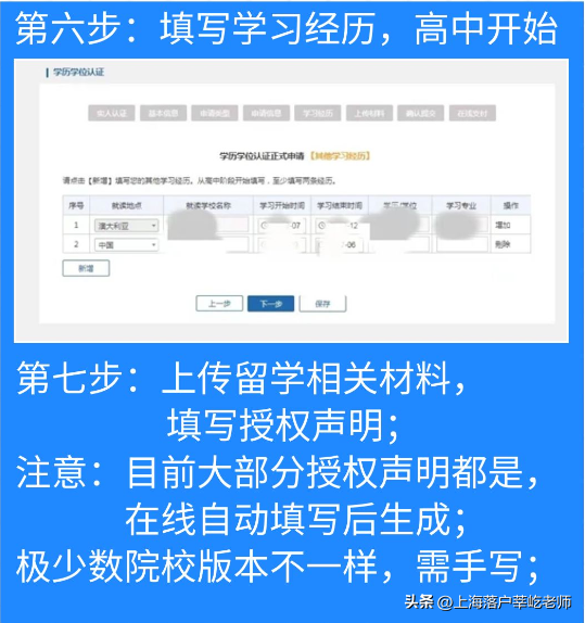 第六-七步:填写学习经历,高中开始,填写授权声明