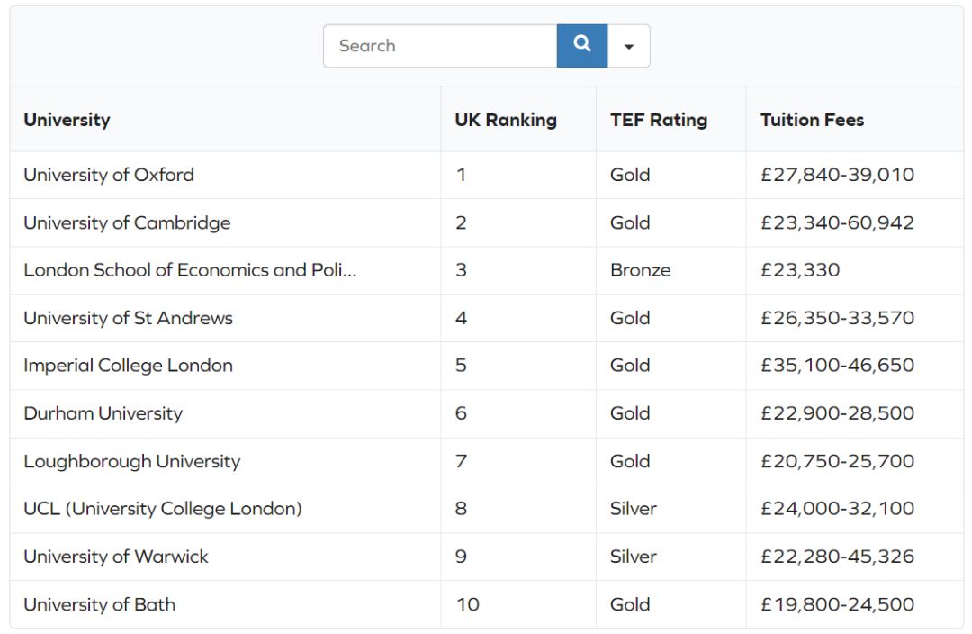 08、杜伦大学2023年QS世界大学排名:92国际生本科学费:£22,900-28,500/年杜伦大学是一所世界著名公立研究型大学,与剑桥大学、牛津大学同为传统学院制的联邦制大学。教学与科研能力十分雄厚,多个院系位列全英第一,是英国仅有一所全部学科均排名前10的大学,也是著名的罗素大学集团、科英布拉集团、全球大学高研院联盟和N8大学联盟的成员。学校尤以商科闻名,商学院是同时拥有EQUIS、AMBA和AACSB三重认证的商学院,位列世界排名前1%的顶尖商学院、英国十大商学院之一,录取门槛颇高,被称为“985俱乐部”由来已久,硕士项目主要面向中国Top70院校。另外,在法律、教育、经济学、金融、人文社科等专业杜伦也造诣颇深。该校热门专业的学费都不算很高。比如,工程类专业每年的学费为28,500英镑,计算机科学专业每年的学费为27,500英镑,商学院各专业每年的学费在23,000-35,000英镑。07、伦敦政治经济学院LSE2023年QS世界大学排名:56国际生本科学费:£23,330/年作为顶尖的社会科学研究学府,LSE开设的众多社会科学学科多年在QS世界排名中位于第2名,仅次于哈佛大学,也是英国录取率最低的大学之一。在社会、政治和经济科学领域享有卓越口碑,也是法律、金融、管理学、会计、经济学、国际关系、政治学、哲学、人类学、社会学、社会政策等方面研究的全球先驱。该校最贵的是金融学专业,每年的学费超过40,000英镑。其余商科及管理类相关专业每年基本都是34,128英镑。