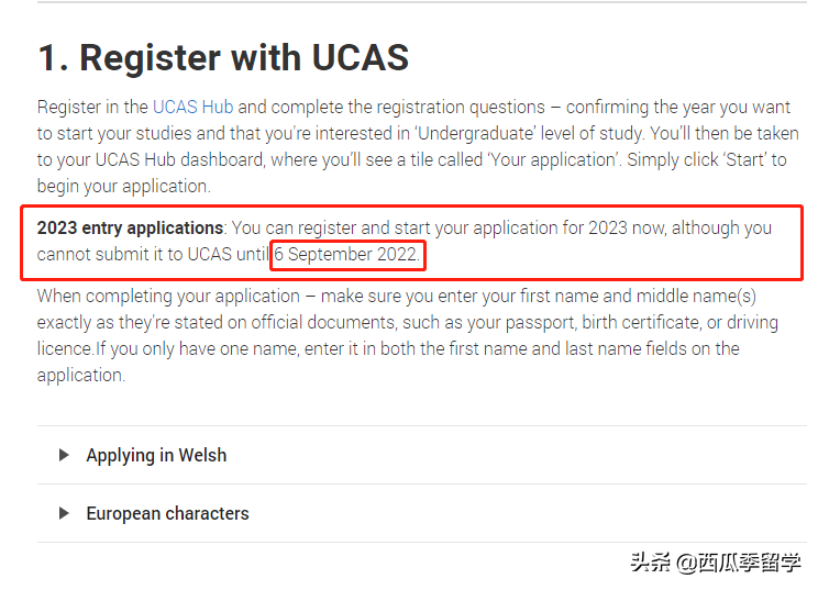 英国本科申请主要是通过UCAS系统,基本是在每年的9月份开放下一年的入学申请,以英国2023年的入学申请为例(见下图),UCAS的开放申请注册时间为2022/09/06。
