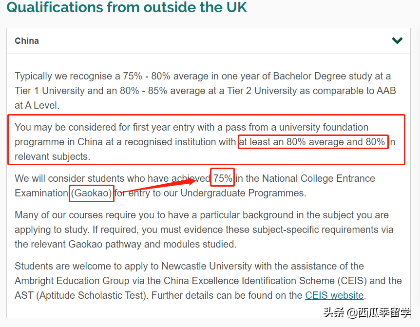 以纽卡斯尔大学(QS排名122、 Times排名28)的本科管理专业录取要求为例,纽卡斯尔大学接受不同学历背景的申请。例如国内大一转学、本科预科、高考直录以及其他形式背景的同学申请(例如CEIS、AST等,因不是主流,这里不具体例举)