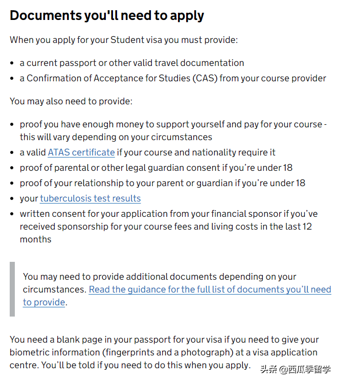 留学签证是在已经确认拿到大学的无条件录取以后才能开始办理签证。一般学校在你缴费完成以后给给你出一个CAS Number,这个CAS里面就包含了你申请学校的所有申请材料信息,你只需要按照签证要求提供对应的申请材料即可。具体的申请流程、资金要求、需要的材料等等都可以在英国签证官网找到,附带英国留学签证申请官网链接。