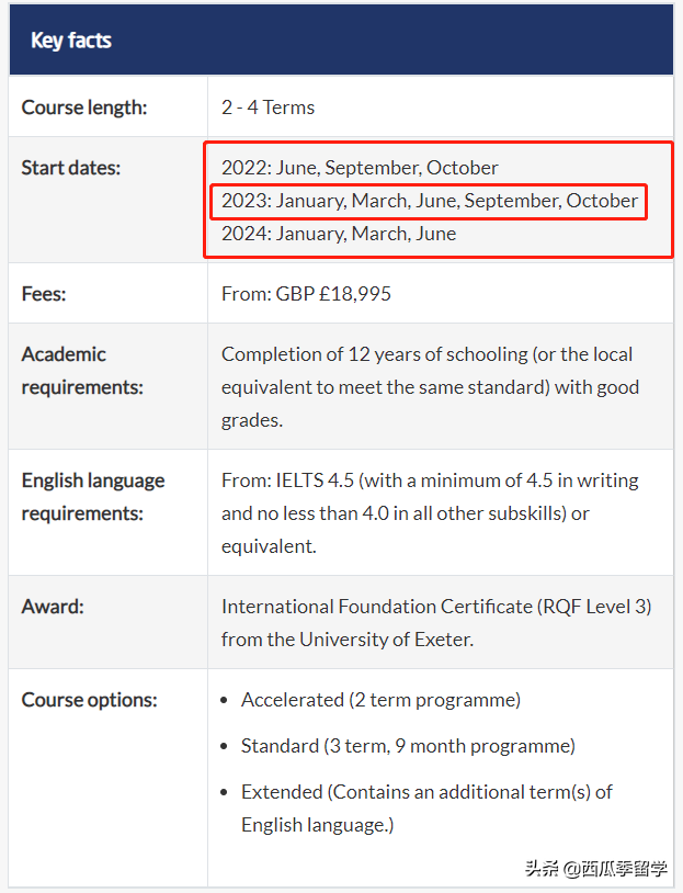 以2023年INTO的预科入学时间为例,总共有1月、3月、6月、9月和10月5个开学时间段,考虑到英国9月是开学季,且大多都是国内参加完高考以后开始申请的,所以这里具体以9月开学的课程为例!