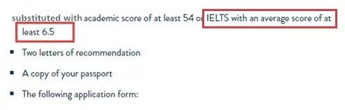 语言要求:雅思总成绩不得低于7分, 4个分项不得低于6分。