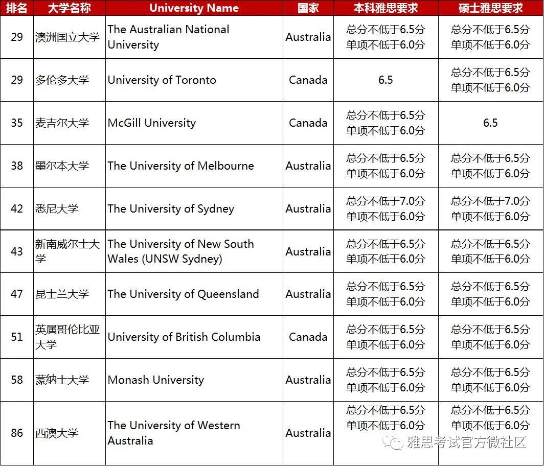 下面是2020QS世界大学排名TOP100中加、澳两国的院校排名及雅思成绩要求,大家可以参考下: