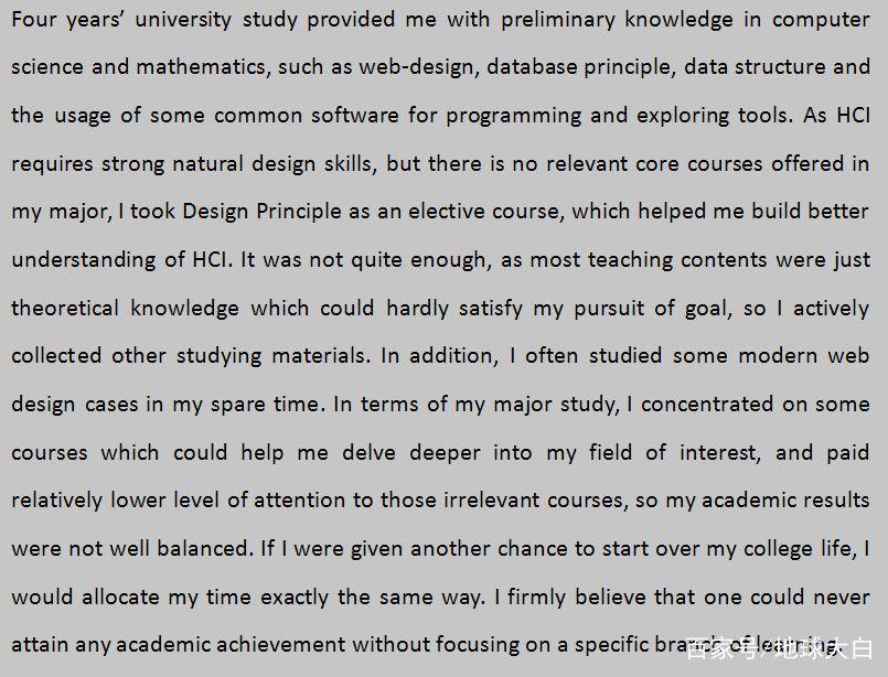 5) 个性化内容,鼓励同学们把自己个性化的内容体现在PS 中,比如:兴趣起源、音乐天赋、体育特长、参与的研究项目、发表的论文、拍摄的短片、解决的社会问题、受益的交换经历、难忘的旅行、平均低的原因(非借口)、特别擅长的科目等。