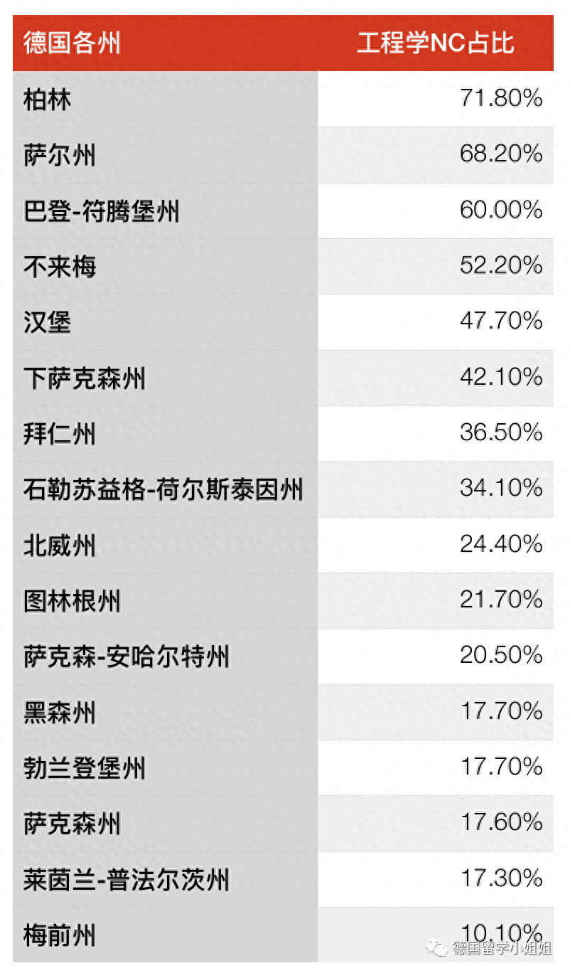 而在黑森州、勃兰登堡州、萨克森州、莱茵兰-普法尔茨州、梅前州,工程类专业的NC占比不足20%,申校压力远远低于柏林。